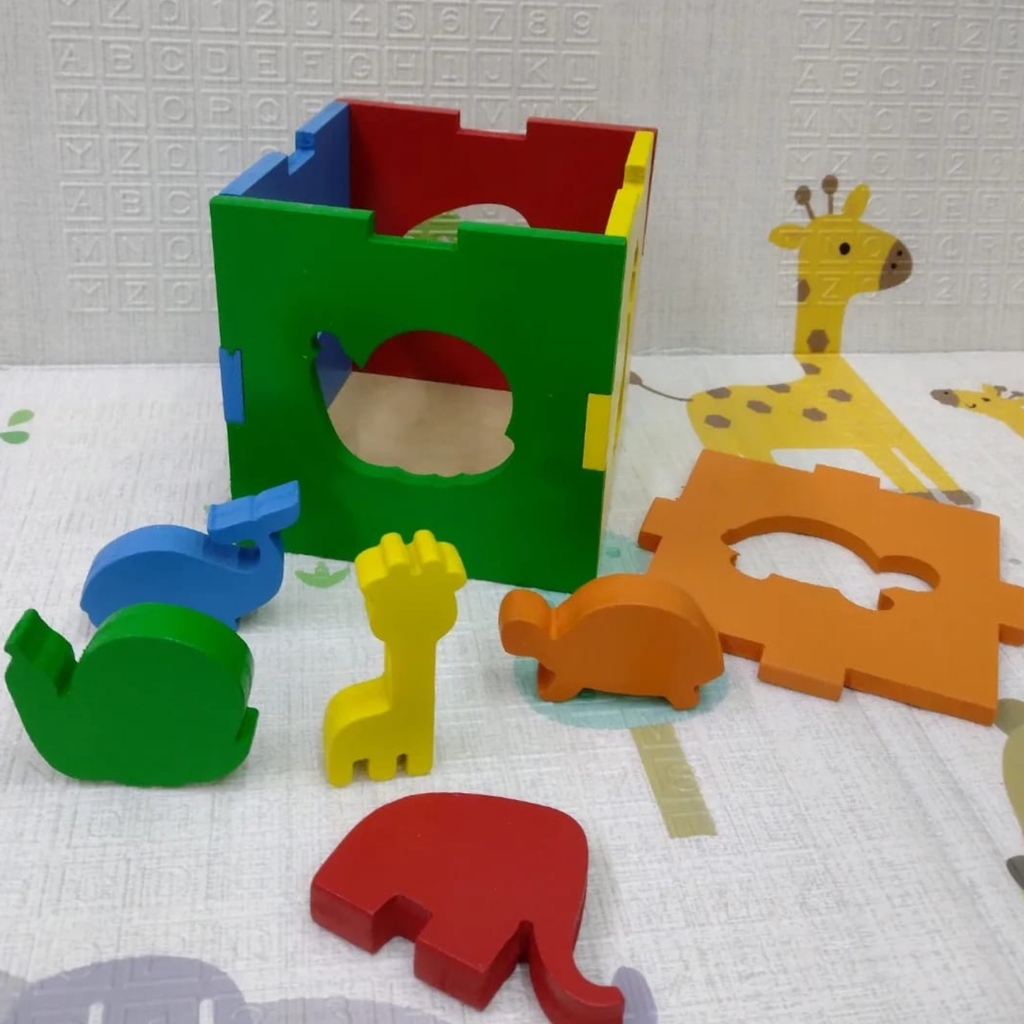 Divertido cubo donde los niños pueden encastrar animalitos que corresponden a color y forma.