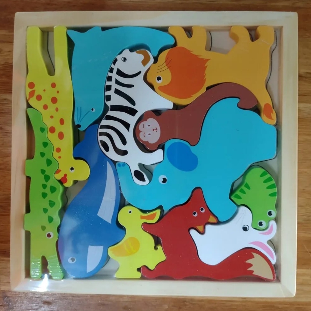 Cuenta con 12 Coloridos piezas de madera para encastrar y base del puzzle en madera